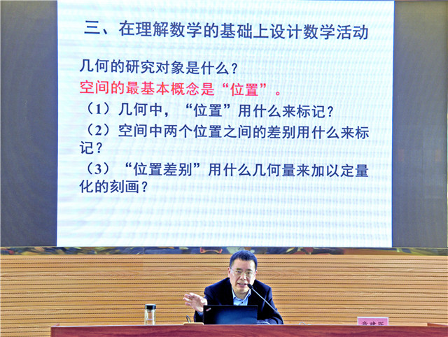 随后,章博士做《我们应该如何教几何》讲座,提出课程核心素养落地的关键是教师在教学设计上下功夫,基于学生原有认知与兴趣基础突出问题和目标导向,强调教学的指导思想是“几何要教类比,代数要教归纳”,指出数学教学的套路是“概念—性质—应用”,掌握一般观念对发展教师的核心素养至关重要。