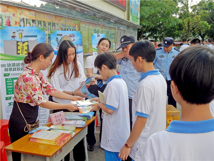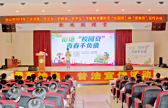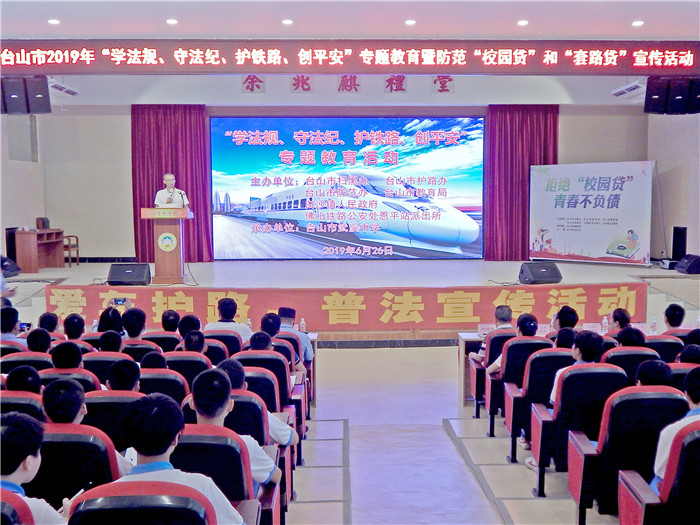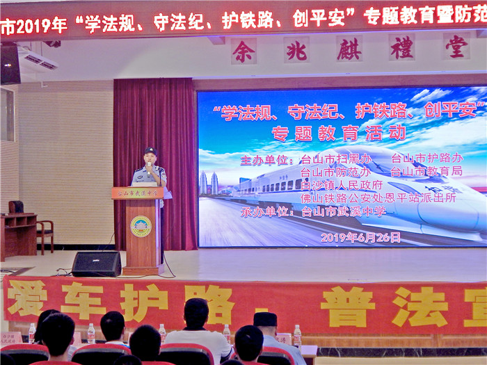 6月26日,市扫黑办、教育局、护路办、防范办、金融办、白沙镇人民政府、佛山铁路公安处恩平站派出所、人民银行台山支行在武溪中学余兆麒大礼堂联合举办2019年台山市“学法规、守法纪、护铁路、创平安”专题教育暨防范“校园贷”“套路贷”宣传活动,市委政法委专职副书记何健旺、各单位相关负责同志以及武溪中学师生代表参加活动。