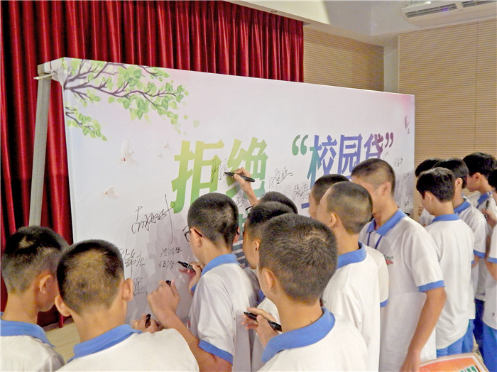 武溪中学学生代表发出“拒绝校园贷、青春不负债”倡议,参加活动的人员纷纷签名承诺。