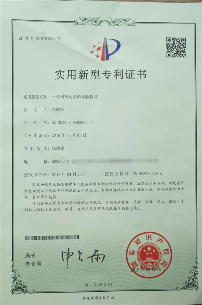 近日,台山市特殊教育学校教师邝耀军老师设计的”相对运动体验教具”获得国家实用新型专利,专利号:ZL201820462807.0。相对运动的体验教具,是模拟了火车站的案例制作而成,由活动的车厢和可移动的参照物以及固定的参照物组成。让体验者坐在车厢内观察移动参照物,操作者推动移动参照物向前或向后移动,也可以推动车厢,然后让体验者通过前面的观察孔确定是参照物或车厢是否在运动,再让体验者通过底部观察孔确认自己的判断是否正确,以此来体验相对运动的原理。