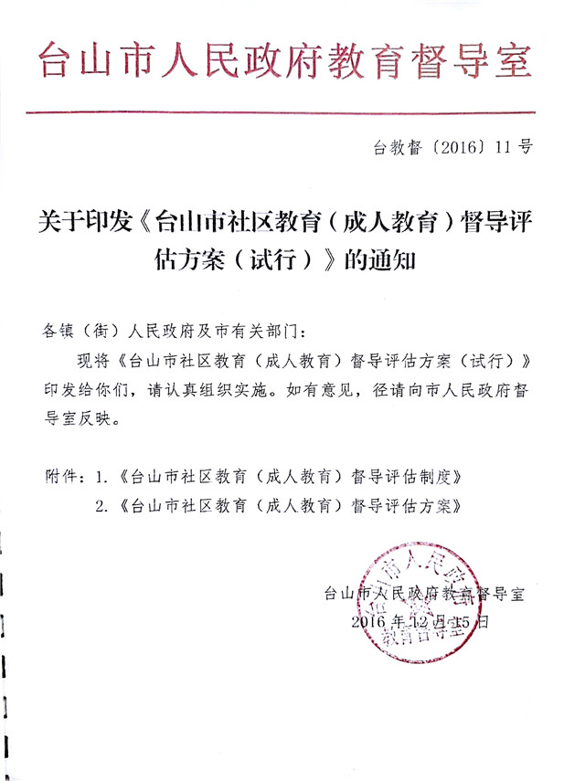 市委、市政府高度重视社区教育,市主要领导多次深入各社区调研,科学做出顶层设计,将其列入台山市“十三五”,并将创建“广东省社区教育实验区”列为市重点推动工作,出台《台山市开展社区教育实施意见》《台山市社区教育五年发展规划》,成立领导小组,制订实施方案,健全工作机制,定期召开联席会议进行研究部署和协调发展,将社区教育工作规范化、常态化、制度化,形成了政府主导、部门合力、社会支持的良好局面。