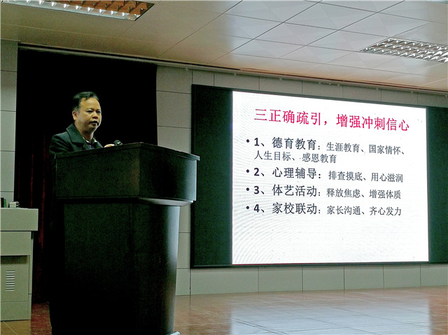 三、正确疏引,增强冲刺信心。对学生做好德育教育工作,包括国家情怀、人生目标、生涯教育和感恩教育。对存在风险进行排查摸底,及时进行心理辅导干预,确保全体学生备考心理健康。