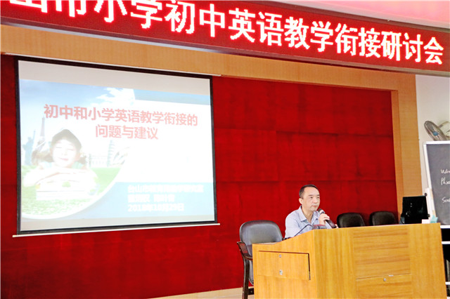 雷炳权、陈叶青共同做《初中和小学英语教学衔接的问题与建议》讲座。讲座中,雷炳权指出小学、初中英语教学衔接的必要性,提出小学英语教师要有服务意识,努力为初中输送更多优质的生源,初中英语教师要有了解小学教学情况及学生已掌握的知识和技能的主动意识。雷炳权还介绍了小学教学情况、教学总体目标、新英语课程标准和英语学科核心素养。