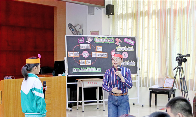 活动首先展示两节听说课。台城白水小学谭艺莺老师给白水小学六年级学生上粤人民版六年级上册Unit4KeepingClean(Story),育英中学谭丽蓉老师给育英中学七年级学生上外研版七年级上册Module3Unit1MySchool,两个课堂充分体现了该学段该有的课堂特点。