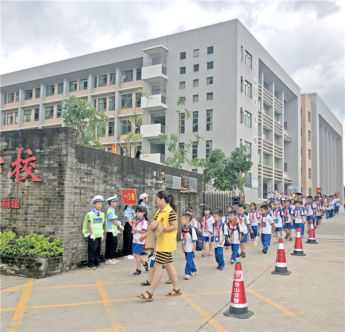 交警大队向学校赠送交通劝导活动装备。穿着统一制服、装备齐全的“小交警”,在民警的带领下展示了交通指挥手势操,随后“上岗执勤”,指挥同学们列队放学,维护离校秩序,并在交警、家长志愿者和老师们的帮助下指挥校门口交通,劝导接送家长有序停放车辆,提醒过往车辆注意礼让,减速慢行。