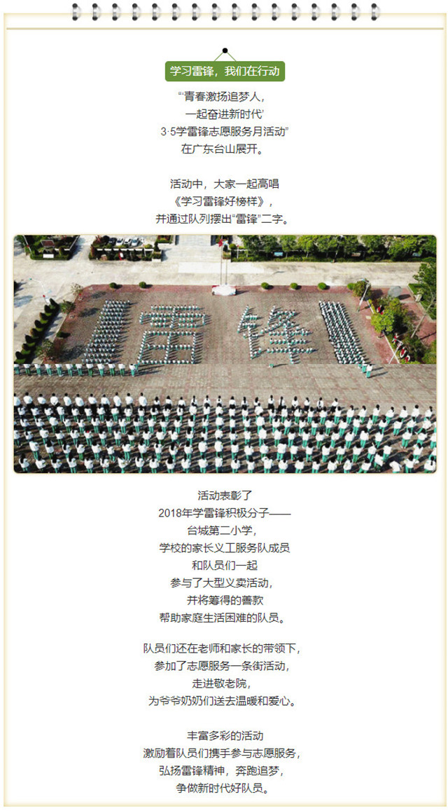 中国红领巾官方公众号推送文章《我们都来学雷锋》,共推选了辽宁鞍山、广东台山、山东济南三省地的学雷锋活动,台山市教育局举办的学雷锋启动活动榜上有名,成为全国经典活动案例。
