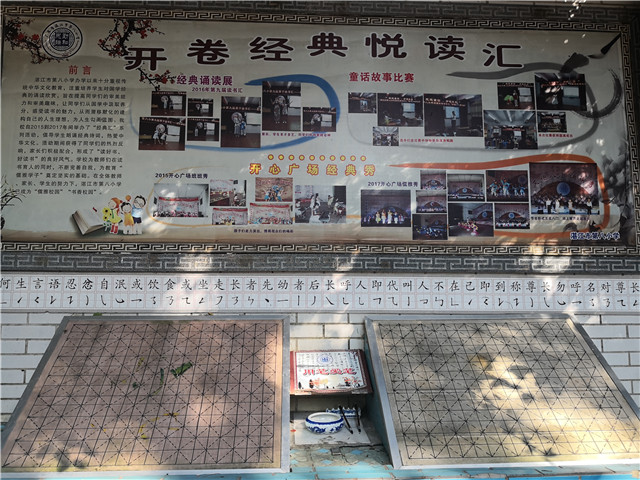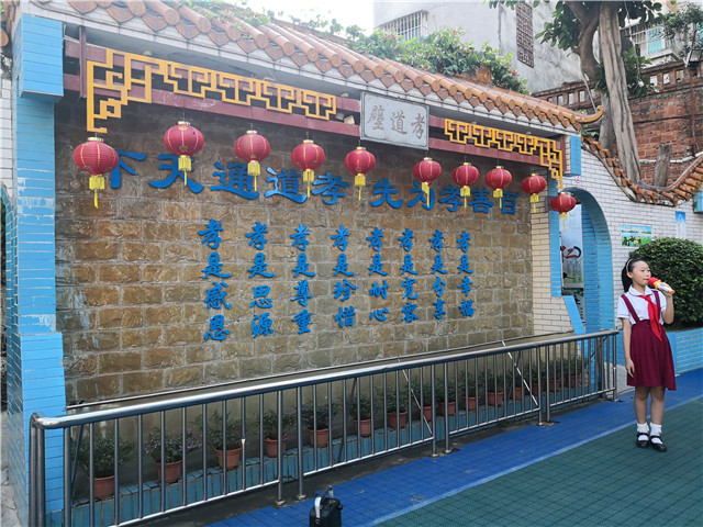 校园面积并不大,却处处巧花心思,步步皆成儒雅景观,六艺廊、孝道壁、悦读汇、书法长廊……无不浸染浓郁的传统文化氛围。