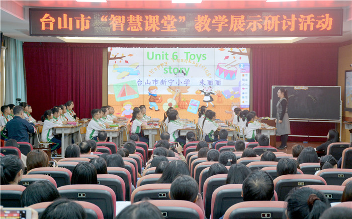 研讨活动中,新宁小学李映纹和朱丽丽两位教师展示了语文、英语两节基于智能教学环境的“智慧课堂”课例。李映纹执教《王戎不取道旁李》,依托台山教育云平台,设计了以教学平板为主要手段的课前预读、课中互动、课后展示等环节,巧妙地将古文教学与信息技术深度融合,激发学生的学习兴趣,大大提升了课堂教学效率。朱丽丽执教《Unit 6 Toys》,完美结合电子书包的强大功能,让学生分组录制作品,上传互看互评,堂上推送练习,完成提交即时显示对错。整节课生动活泼,学生参与度高,充分体现了信息技术在英语课堂上的应用优势。
