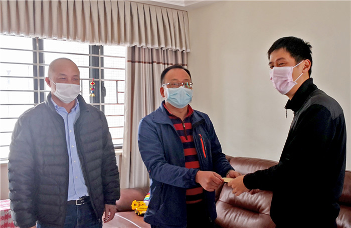 2月20日,市教育局党组成员黄国盼、市教育工会主席陈卓光、台山侨中校长黄生足一行,前往慰问我市援鄂医护人员伍夏樱的家属陈卓英老师。