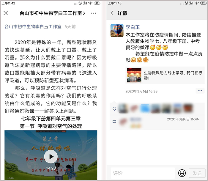 李白玉一手抓好学校线上教育管理工作,一手组织打造自己所教学科的线上教学模式,她转变传统教学观念,构建以信息化技术为支撑的多元融合教学设计思路,设计了“教学资源准备、课前沟通、课堂授课、答疑解惑、教学反思”全线上教学流程。课前,通过微信群与学生提前就课程内容、学习重难点等指导学生预习;课上,重视课堂互动,积极引导学生主动思考,及时回答问题;课下,利用问卷星完成作业,学生完成作业后可马上知道自己哪道题错误,然后通过截屏的形式将疑问上传至微信群,由老师及时解答,尽可能在全线上教学模式下,锻炼学生的动脑动手能力。此外,作为台山市初中生物工作室主持人,李白玉把工作室全体教师的智慧及力量凝聚起来,与工作室全体教师进行接力录制微课,以初中生物工作室微信公众号的平台作为资源推送的主阵地,有序地整理推送了七、八年级下册及中考复习等微课,为筑牢线上教育“新阵地”再立新功。