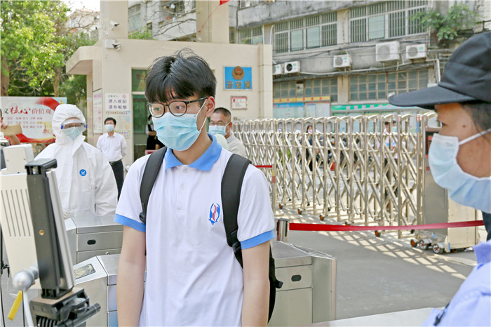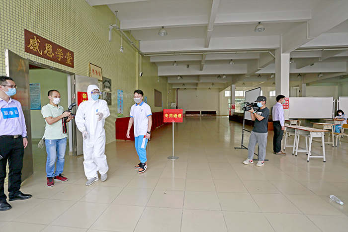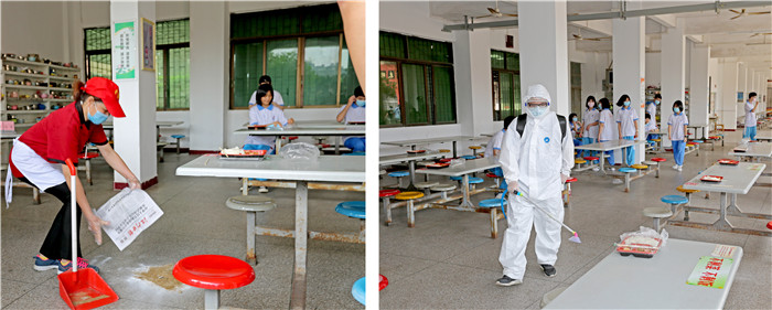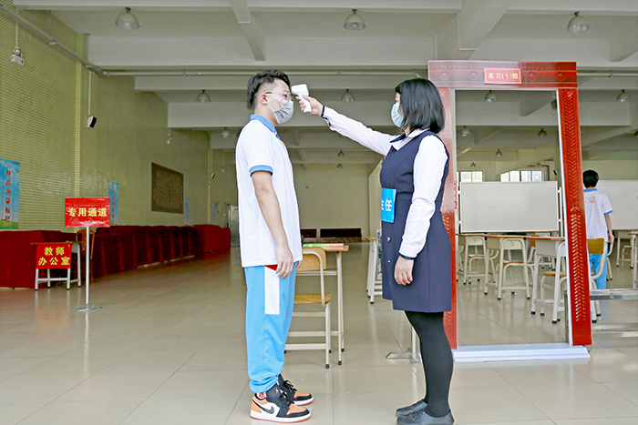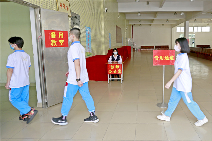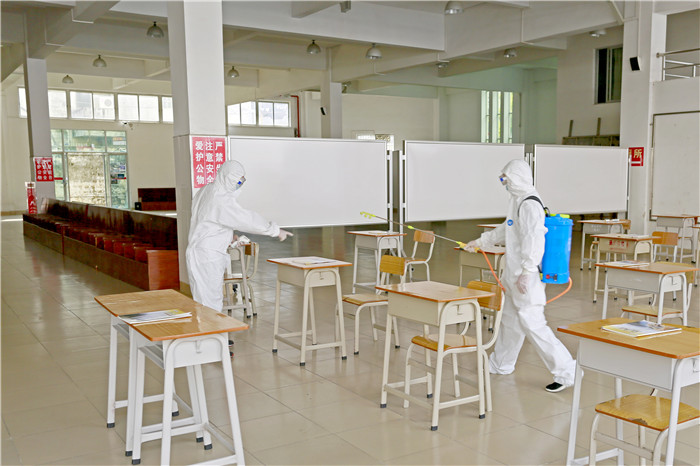 开学后,学校采用分班教学,改用小班制,人数为原来班级的一半,并在课室设置隔离通道、疏散通道等专用通道,配齐配足体温探测器、一次性手套、医用口罩、消毒液等防控物资。