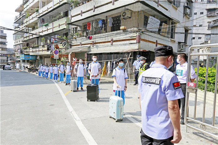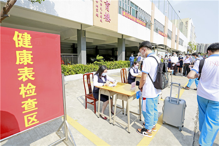 为尽可能减少交通拥堵,学校实行分批错峰上学。学校提前通知学生尽量避免乘坐公共交通工具上学,尽可能乘坐私家车返校。到达校门指定位置后,车辆和陪同人员不得进校并听从交警与安保人员的指挥,有序驾车离开。学生拿好行李后,在值班教官的引导下,排队等待检测后方可入校门。