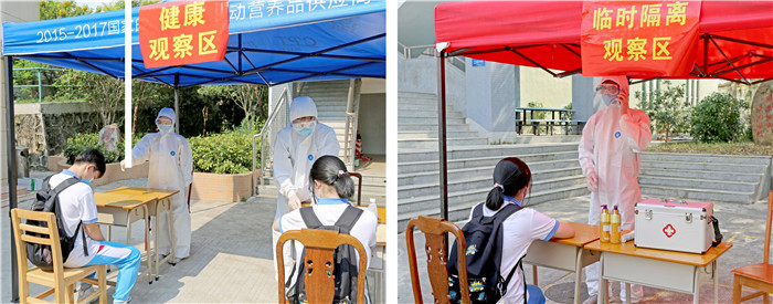 学校分别独立设置了校门口双向通道、间隔排队1.5米标识区、体温检测区、健康表检查区、健康观察区、临时隔离观察区,值班老师、校医和消毒人员“严阵以待”。