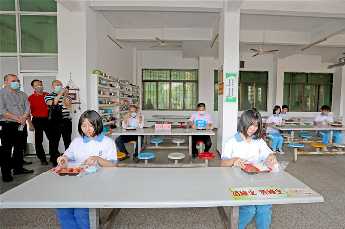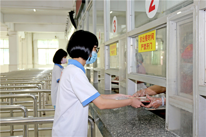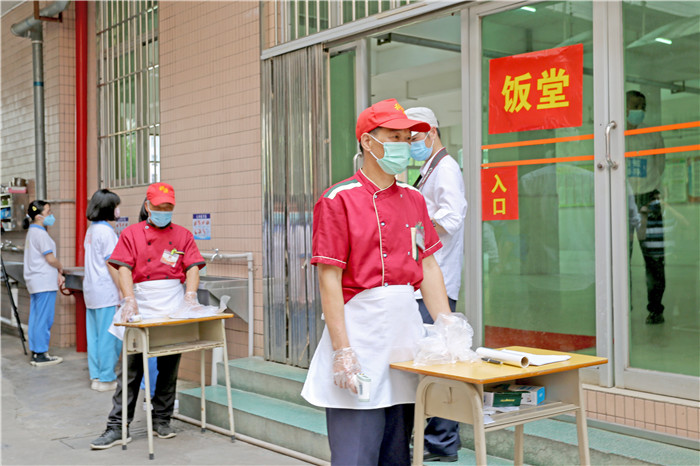 学校实行分年级错峰就餐、单人单向就餐的就餐模式,并全面配置学校领导陪餐制度,以应对突发事件。