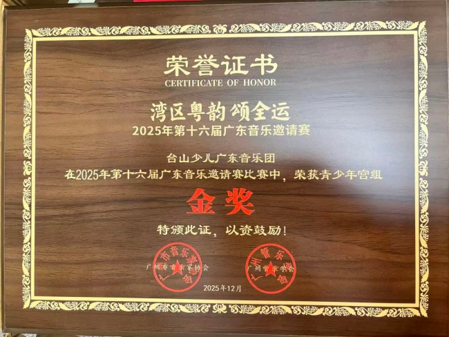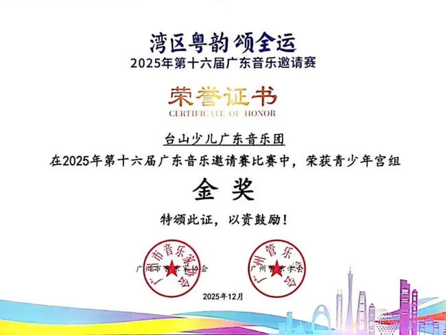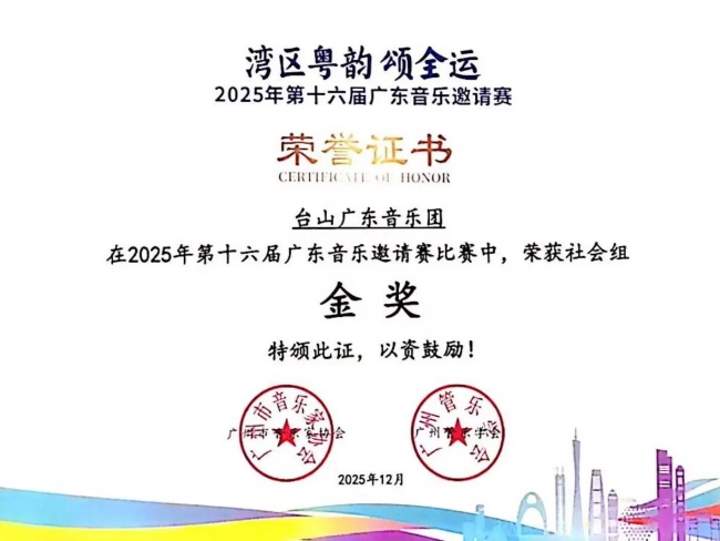 台山广东音乐团在“湾区粤韵颂全运”2025年第十六届广东音乐邀请赛中再获佳绩,荣获多个大奖及金奖证书。“湾区粤韵颂全运”2025年第十六届广东音乐邀请赛于月前在广东文艺职业学院(番禺校区)成功举办。本次赛事在广州市文学艺术界联合会、广东省音乐家协会的指导下,由广州市音乐家协会、广州管乐学会联合主办,广东文艺职业学院、广州大学音乐舞蹈学院、广州市音乐家协会广东音乐艺术委员会共同承办,我市4支队伍参加该项比赛,获得2金1银1铜的好成绩。
