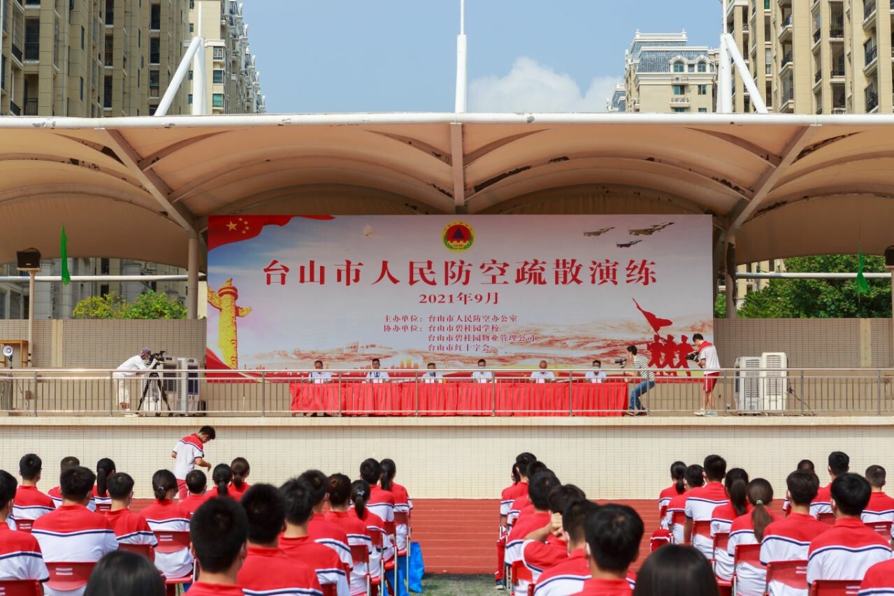 为提高我市群众的人民防空疏散掩蔽能力,增强人防意识,2021年9月13日上午10时,台山市住建局(市人防办)联合碧桂园学校的师生举行台山市人防疏散演练活动,市政府办公室副主任罗小红、市住建局党组书记、局长、市人防办主任刘文、市教育局、市应急管理局有关领导和台山碧桂园学校的师生参与演练。