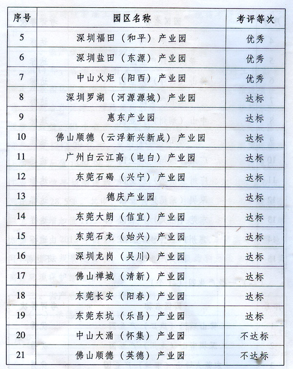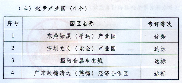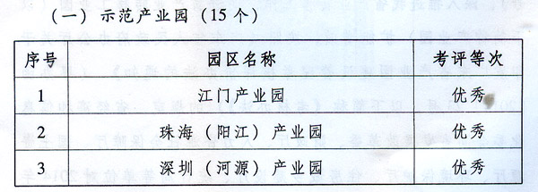 按照《考核办法》有关规定,对评定为优秀等次的江门产业园、珠海(阳江)产业园、深圳(河源)产业园、佛山顺德(廉江)产业园、深圳南山(龙川)产业园、东莞大岭山(南雄)产业园、珠海(阳江万象)产业园、深圳福田(和平)产业园、深圳盐田(东源)产业园、中山火炬(阳西)产业园、东莞塘厦(平远)产业园等11个园区予以全省通报表扬,并按照规定给予相应奖励。对考评不达标的汕头产业园、中山大涌(怀集)产业园、佛山顺德(英德)产业园予以全省通报批评,并暂停其享受省产业转移政策;对考核不达标并在同类园区排名最后的汕头产业园、佛山顺德(英德)产业园予以黄牌警告,并对当地政府主要领导进行约谈。