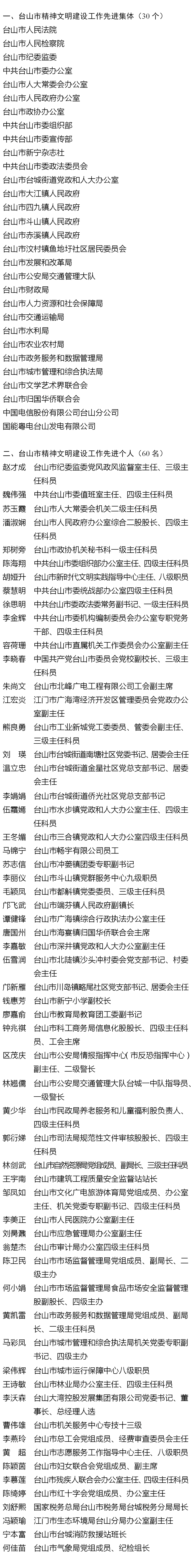 台山市精神文明建设工作先进集体和先进个人名单 (排名不分先后)