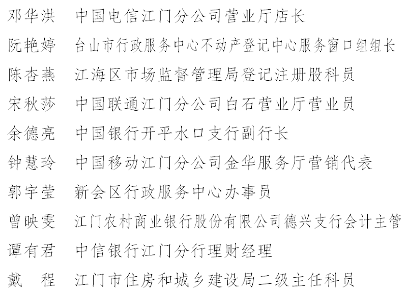“最美窗口标兵”名单