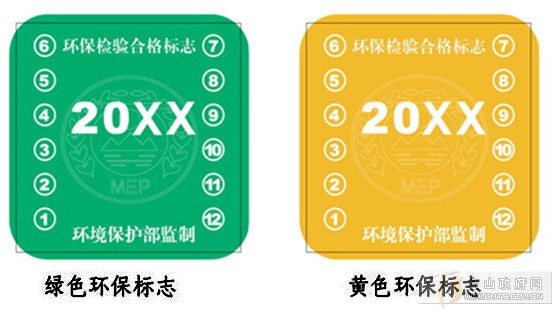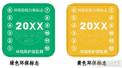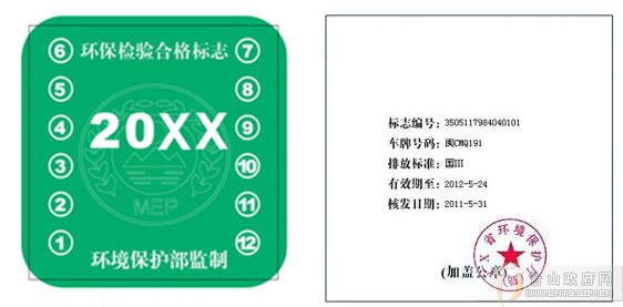 环保标志,分正副本两张,上面有标志编号、车牌号码、排放标准、核发日期和有效日期。其中,有效日期和年审日期同步。