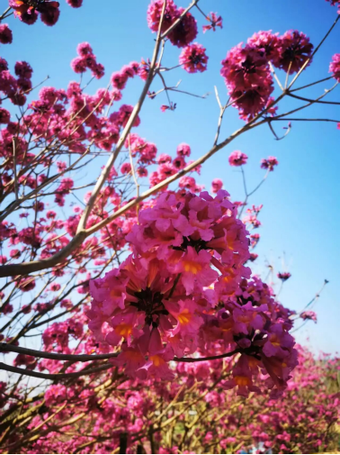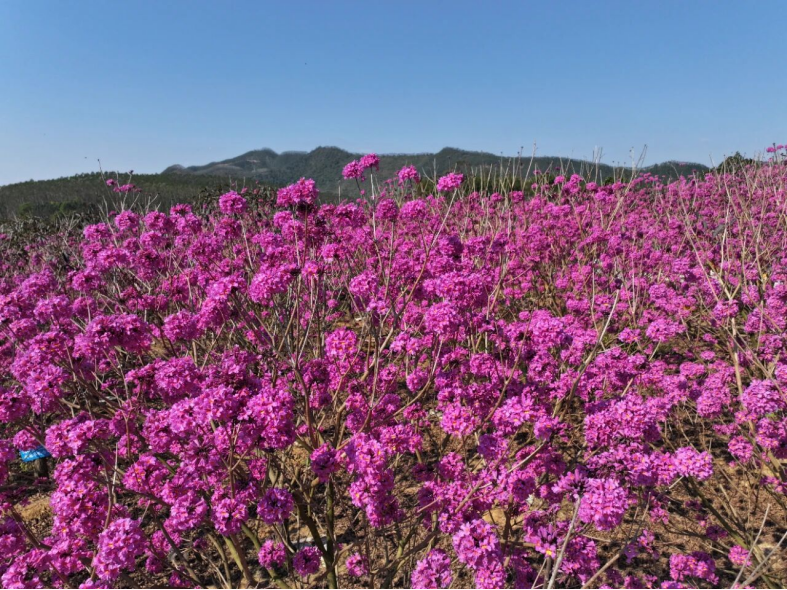 据了解,紫花风铃木也常被称作紫风铃,它是紫葳科风铃木属的落叶小乔木,原产于巴西等南美地区,因花型呈钟状、花色紫粉艳丽而得名。紫花风铃木最佳观赏期为每年12月至次年3月,华南地区如广东、广西花期会稍早,1-2月为观赏黄金期。