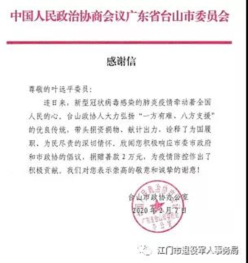 台山市政协委员会接收了捐赠,向叶远平颁发了捐赠感谢信,向他积极承担社会责任、为新型冠状病毒感染的肺炎疫情防控工作贡献力量表示衷心感谢,给予高度赞扬和崇高的敬意。