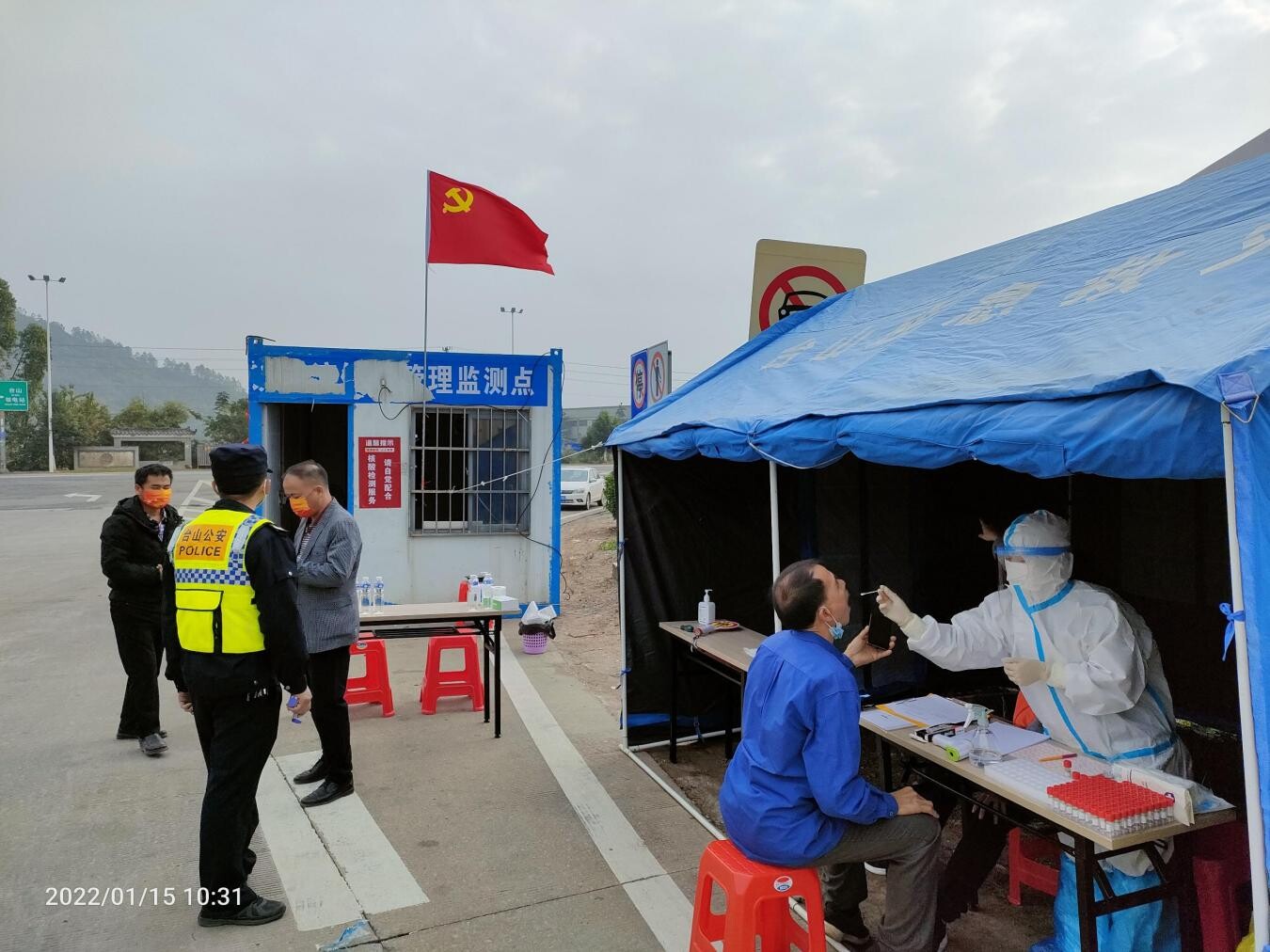 检测棚、隔离栏、警戒线,医护人员、民警、工作人员、党员志愿者……经过一夜的紧急响应,1月15日一早,赤溪镇核酸筛查准备工作一切就绪,各个采样点工作在井然有序的氛围中准时启动。