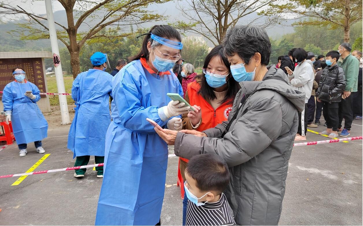 志愿者协助群众扫码登记信息