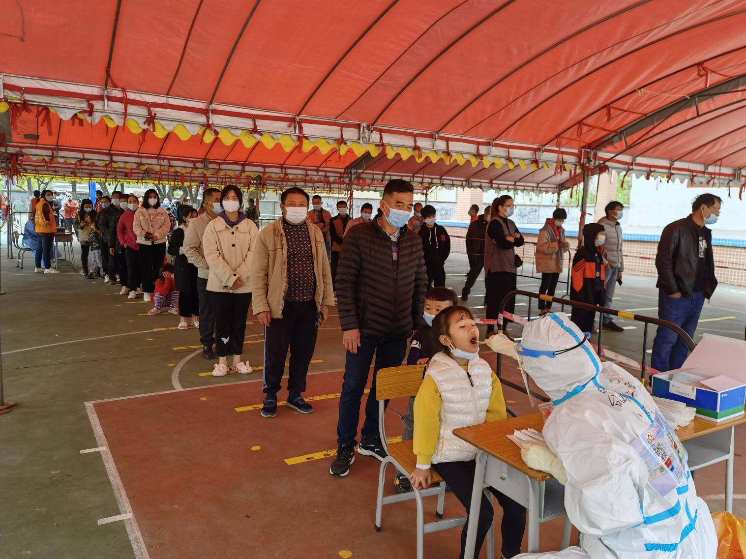 群众照标示线排成一列,耐心等待核酸采样