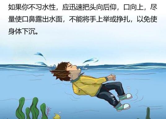 放松全身,让身体漂浮在水面上,将头部浮出水面,用脚踢水,防止体力丧失,等待救援;