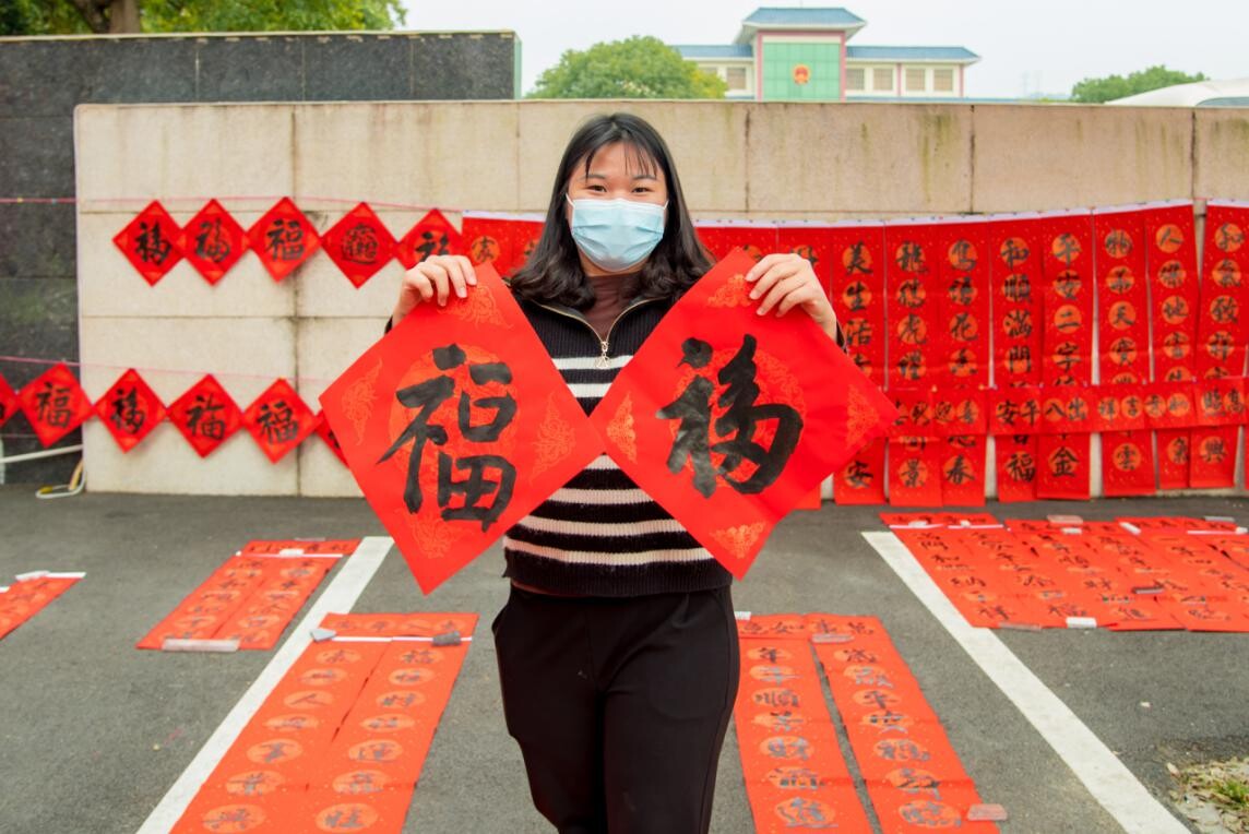 志愿者们也活跃在现场,他们帮助群众扫码测温,协助书法家铺垫纸张,悬挂展示春联作品,把对应的作品送到群众手中。群众一边欣赏书法技艺,一边赏析春联寓意,不由得赞叹不已。林大姐拿到心仪的春联后高兴的说:“过去家里贴的对联都是上镇上买,今天能拿着书写的春联,看到大师的现场创作,特别值得”。
