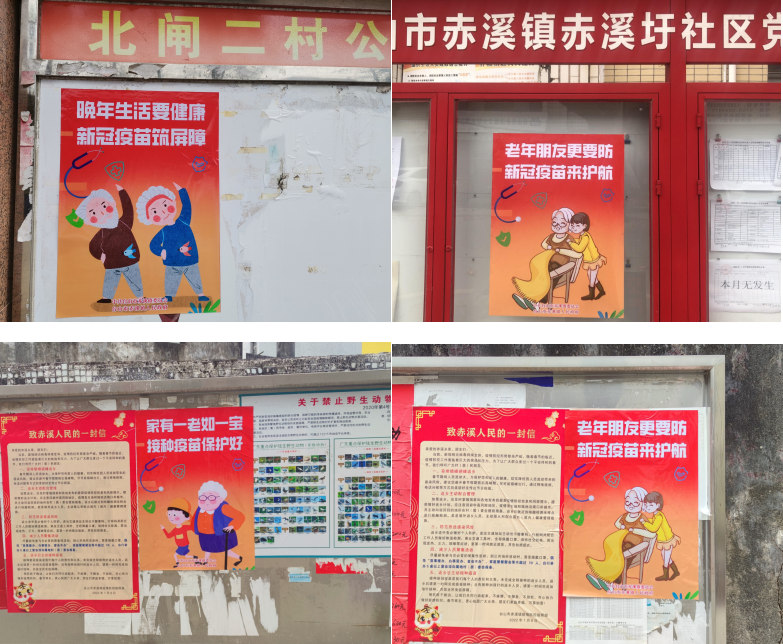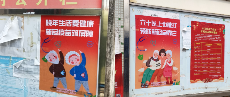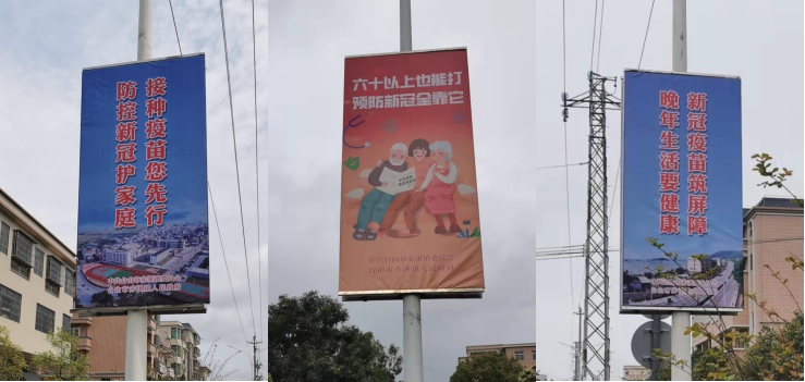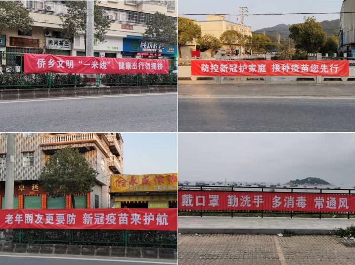 全镇主要路段、人员流动密集区域等动态保持横幅70条以上,主要道路G240关键路口等地布置大型宣传画6幅,宣传栏10个,灯柱广告80幅,“防疫关乎你我他 不能少了老人家”“感冒发烧不要忍 戴好口罩去门诊”“晚年生活要健康 新冠疫苗筑屏障”一条条接地气的疫情防控标语挂在赤溪镇的大街小巷,让群众看在眼里,记在心里。