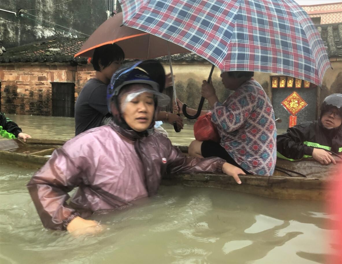 渡头村部分地区地势低洼,积水迅速蔓延,最深可达一米多。得知部分群众被困,渡头村党总支书记唐志发带领驻点干部及村干部迅速开始入户转移。大雨中,他们用一艘渔船来回摆渡,靠人力推动前进,一趟趟把群众转移到安全地点,用自己的身躯守护者群众的生命和财产安全。