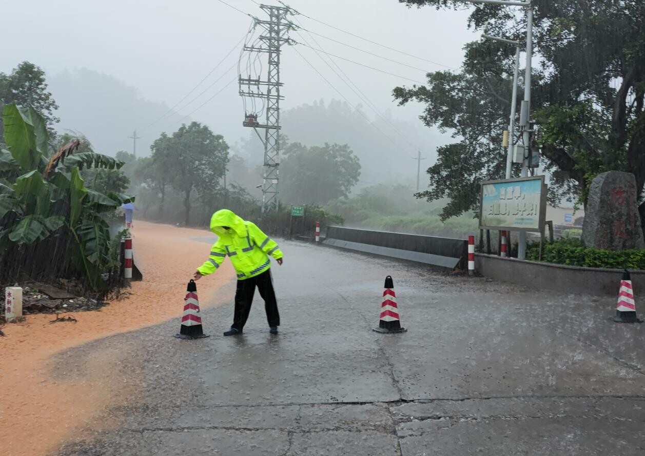 田赤公路部分路段浸水严重,车辆无法正常通行,存在极大的安全隐患,党员干部及时设置路障,实施临时交通管制,确保群众出行安全。