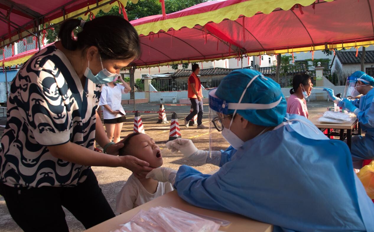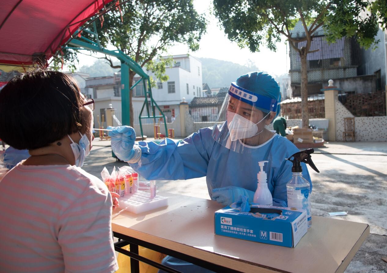 中午时分,猛烈的阳光照在医护人员背上,她们仍一丝不苟的开展采样工作