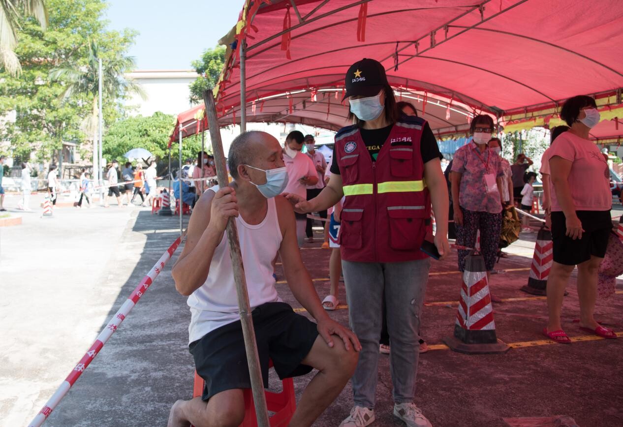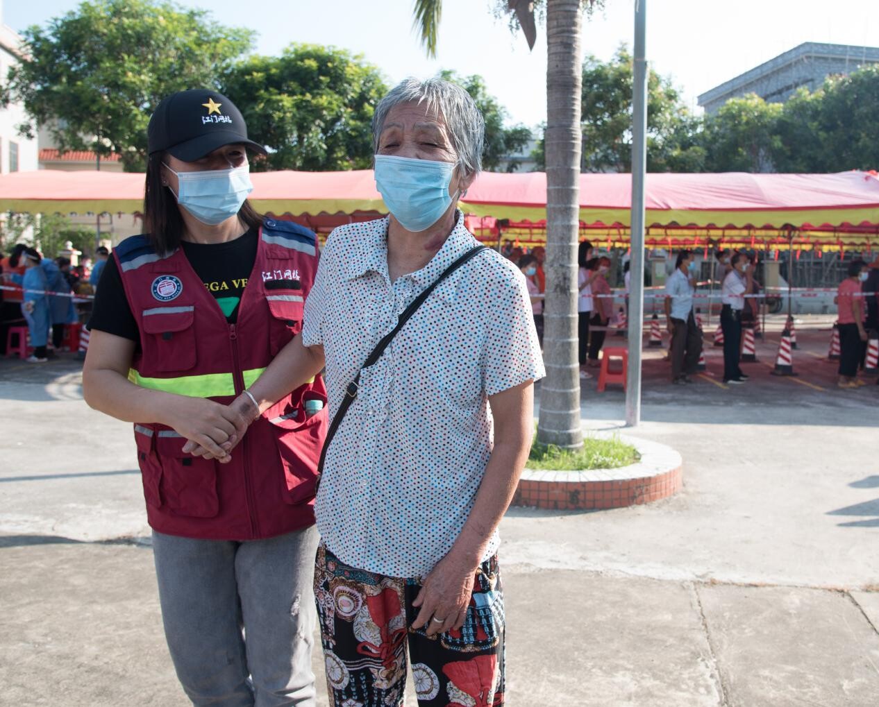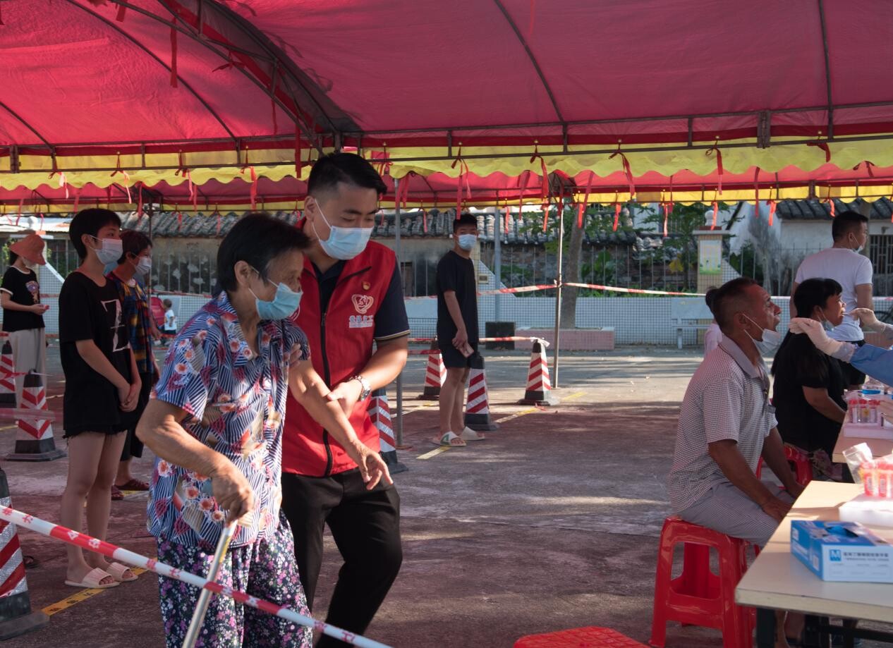 茭笋公园采样点,网格员朱红英正忙碌地穿梭在人群中,“我知道这两位老人身体有问题,一位老奶奶患有心脏病,走起路来手震震的;而这位啊伯失明,看不见东西,所以特别照顾他们,帮助他们完成核酸采样”,网格员朱红英说道。在这次全员核酸筛查中,网格员在全过程中发挥着十分重要的作用,他们利用地熟人熟情况熟的优势,提前摸清情况,主动作为地协助镇政府高效地完成核酸采样工作。