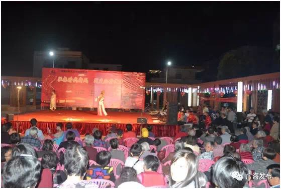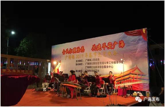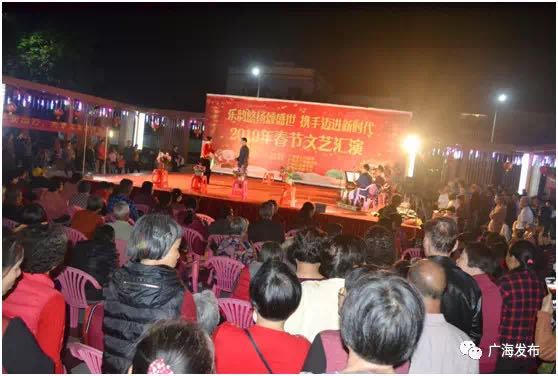 年初一至年初四晚,由老干家曲艺社、广海南湾曲艺社、广海艺术爱好者、广海民间曲艺社在镇文化广场上演了连续四晚的精彩的文艺表演,分别以“乐韵悠扬颂盛世,携手迈进新时代”、“全民扫黑除恶,共建平安广海”、“海丝古镇,文明之城”、“弘扬时代新风,同庆和谐盛世”为主题,吸引了大批群众前来观看,给观众们带来了一场场精彩的艺术盛宴,可谓是精彩纷呈。