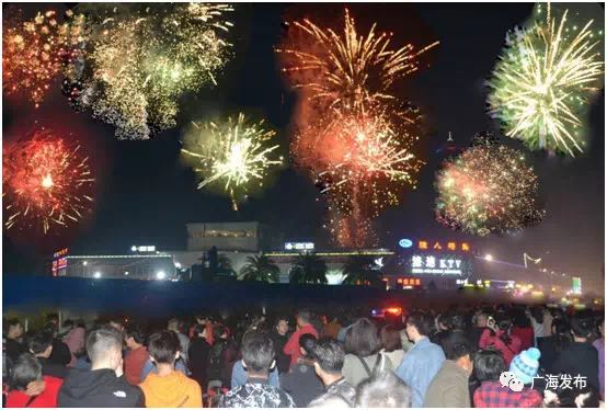 年初二晚,烟花汇演(万众欢腾贺猪年)在广海镇渔人码头上空举行,燃放效果缤纷夺目,吸引了数千名群众前来观赏。