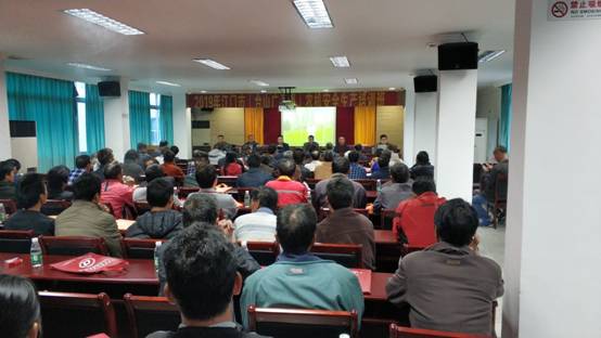 台山市农机股黎庆军同志通过观看农机安全教育警示片、分析本地农机事故案例、观看农机事故录像、学习农机法律法规等四个方面为到会耕手讲解当前农机事故的发生及预防措施。