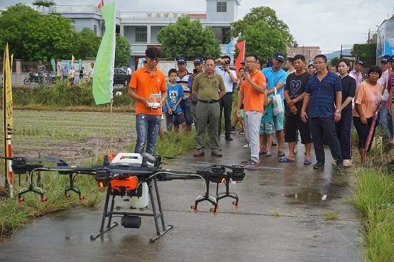 随后,推广员与参会者一起深入田间实操了解自走式履带旋耕机和无人机等新型农机具的技术性能以及应用操作技术。技术人员通过现场操作演示,结合旋耕机办田、插秧机插秧和无人机实地喷药进行讲解。在技术人员授课过程中,农户兴趣浓厚、热情高涨,争相咨询技术人员相关作业问题。