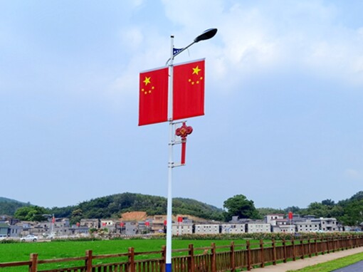 ▲乡村路边悬挂国旗和中国结